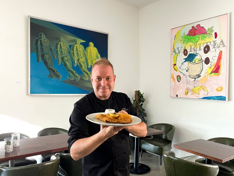 Koch mit fertigem Wiener Schnitzel während Servus TVs "TM Wissen".