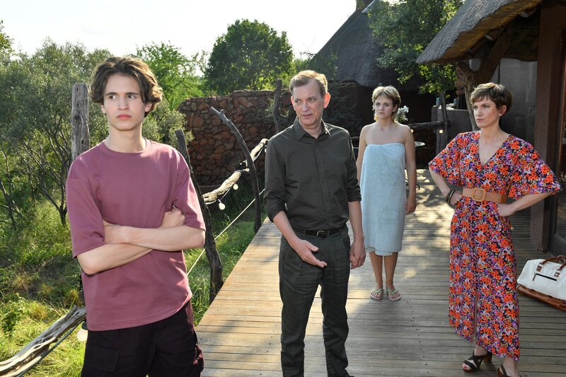 Die gemeinsame Safari soll die Patchworkfamilie Katja Sommer (Isabell Horn, m.), Lisa Sommer (Klara Kleinheins, 2.v.l.), Björn Wagner (Daniel Krauss, 2.v.r.) und Paul Wagner (Cooper Dillon, l.) enger zusammenbringen.