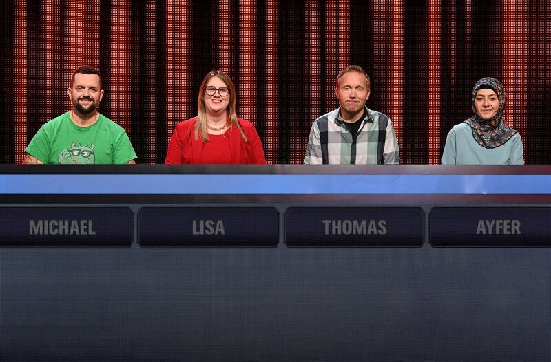 Moderator Alexander Bommes (M.) mit den Kandidat:innen: Michael Böhme (3.v.r.), Lisa Baulig (2.v.r.), Thomas Wispeler (r.), Ayfer Yalcin (l.).Bild: © ARD/Uwe Ernst