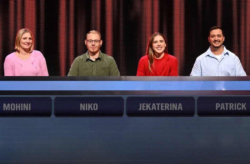 Moderator Alexander Bommes (M.) mit den Kandidat:innen: Mohini Hanuschek (3.v.r.), Niko Prochaska (2.v.r.), Jekaterina "Katja" Gavrilova (r.), Patrick Woelk (l.).Bild: © ARD/Uwe Ernst