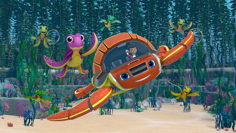 Blaze und AJ lernen am Strand eine niedliche neue Freundin kennen: die Meeresschildkröte Shelly. Shelly weiß nicht mehr, wie sie nach Hause in den Seetang-Wald kommt, also verwandelt sich Blaze in ein Meeresschildkröten-U-Boot, um ihr zu helfen.