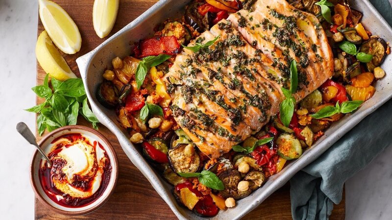 Jamie startet mit Fleischbällchen aus zwei Proteinquellen und bereitet ein Omelett mit Räucherlachs, Roggenbröseln und Feta zu. Ein farbenfroher Salat und ein Hühnergericht mit angebratenen Blaubeeren runden das Menü ab.