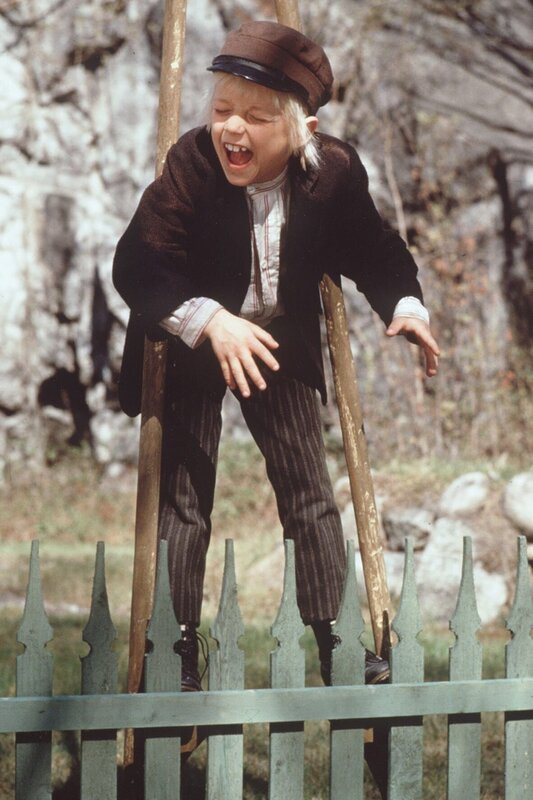 Michel (Jan Ohlsson) hat sich von einem Freund Stelzen ausgeliehen und versucht nun, damit zu laufen.
