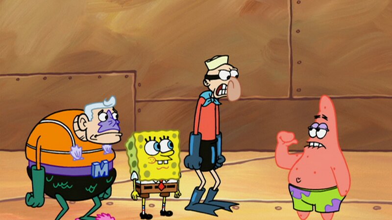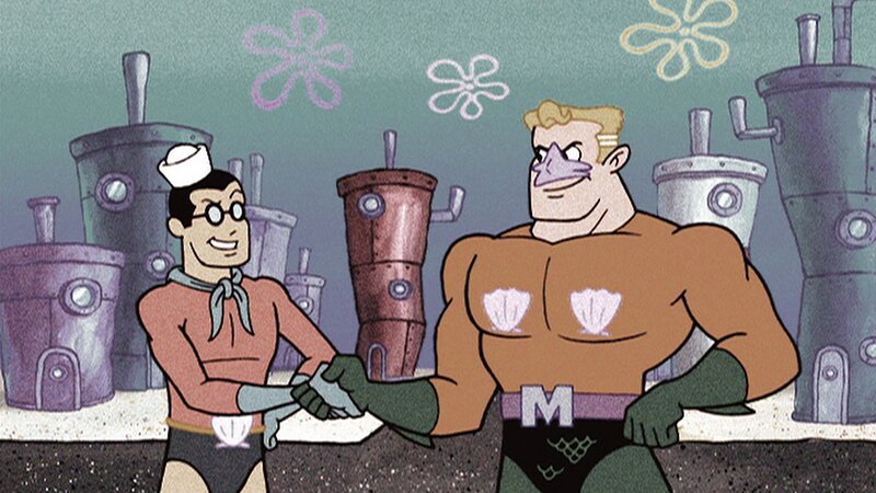 SpongeBob und Patrick dürfen Memorabilia von Meerjungfraumann und Blaubarschbube bestaunen. Patrick aktiviert versehentlich eine Zeitmaschine und sie reisen in der Zeit zurück und treffen auf die jungen Superhelden.