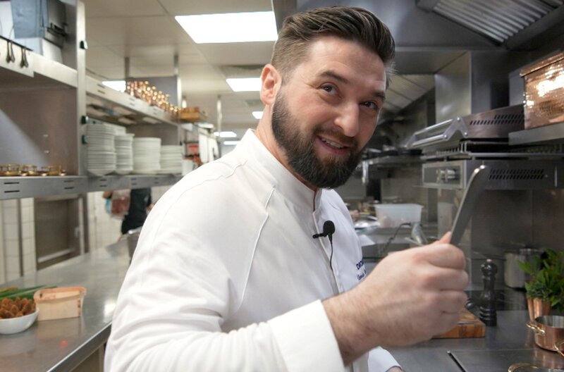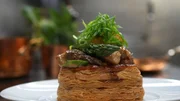 In seinem berühmten Pariser Restaurant zeigt Küchenchef Romain Van Thienen, wie das Blätterteiggericht mit Soße zubereitet wird.