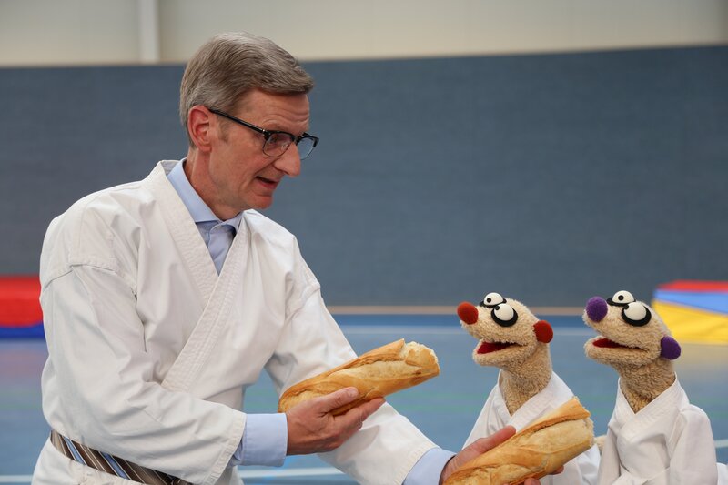 Der Trainer (Marc Barthel) wundert sich - das Brett hat sich in Brot verwandelt