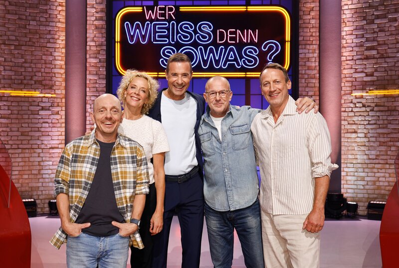 Moderator Kai Pflaume (M.) und seine Rateteam-Kapitäne Bernhard Hoëcker (l.) und Wotan Wilke Möhring (r.) begrüßen in dieser Sendung die Schauspielerin, Sängerin und Autorin Katja Riemann (2.v.l.) und den Schauspieler Heino Ferch (2.v.r.).Bild: © ARD/NDR/UFA SHOW & FACTUAL/Morris Mac Matzen