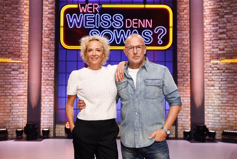 Rateteam-Kapitän Bernhard Hoëcker (l.) mit Schauspielerin, Sängerin und Autorin Katja Riemann (r.).Bild: © ARD/NDR/UFA SHOW & FACTUAL/Morris Mac Matzen