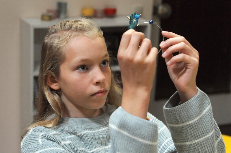 Franzi (Mia Löffler, KLD) bastelt wenig motiviert einen Schlüsselanhänger.