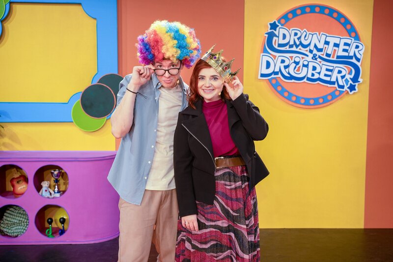Christoph Hirschler und Isabell Pannagl mit Requisiten aus dem Spiel „Lachen verboten!“.