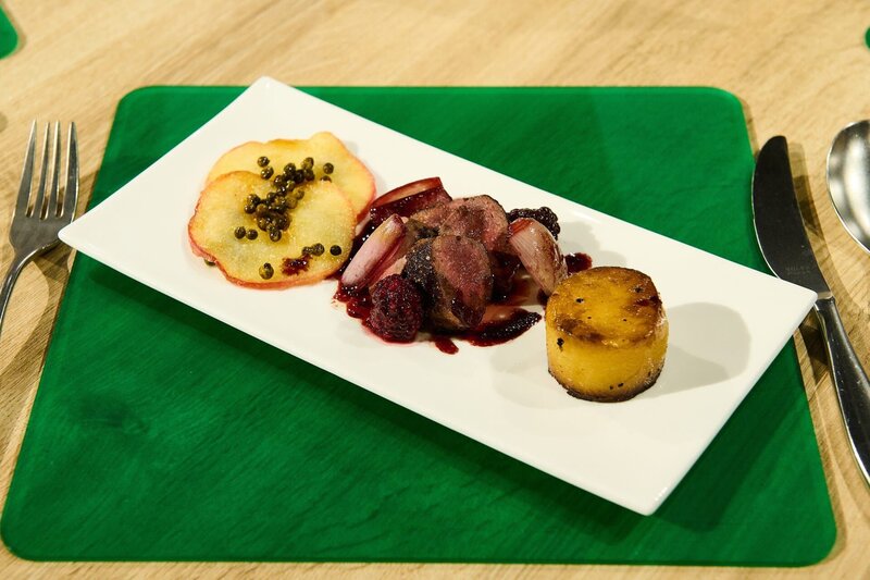 Tagesmotto "11 Zutaten": Hasenrücken mit Balsamico-Brombeer-Schalotten-Sauce, Pfeffer-Äpfeln und Fondant-Kartoffeln von Franziska KolbBild: © ZDF und Gunnar Nicolaus