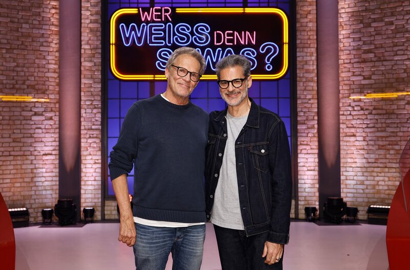 Moderator Kai Pflaume (M.) und seine Rateteam-Kapitäne Bernhard Hoëcker (l.) und Wotan Wilke Möhring (r.) begrüßen in dieser Sendung den Schauspieler, Komiker und Autor Christian Tramitz (2.v.l.) und den Schauspieler und Komiker Rick Kavanian (2.v.r.).