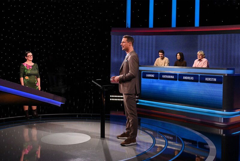 Moderator Alexander Bommes (2.v.l.) mit den Kandidat:innen: Laurenz Lingenthal (3.v.r.), Katharina Stammer (2.v.r.), Dr. Andreas Herde (r.), Kerstin Sauer (l.).Bild: © ARD/Uwe Ernst