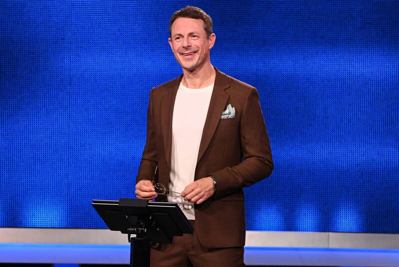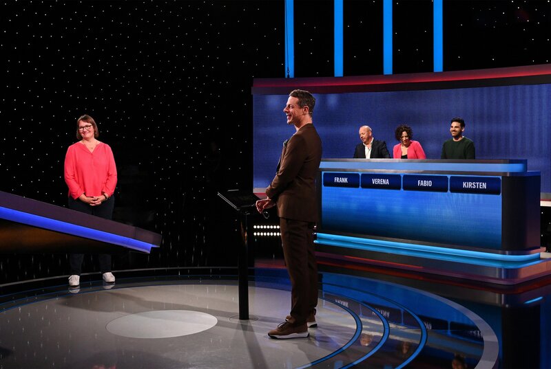 Moderator Alexander Bommes (2.v.l.) mit den Kandidat:innen: Frank Kohnen (3.v.r.), Verena Schuster (2.v.r.), Fabio De Deus (r.), Kirsten Schütze (l.).Bild: © ARD/Uwe Ernst