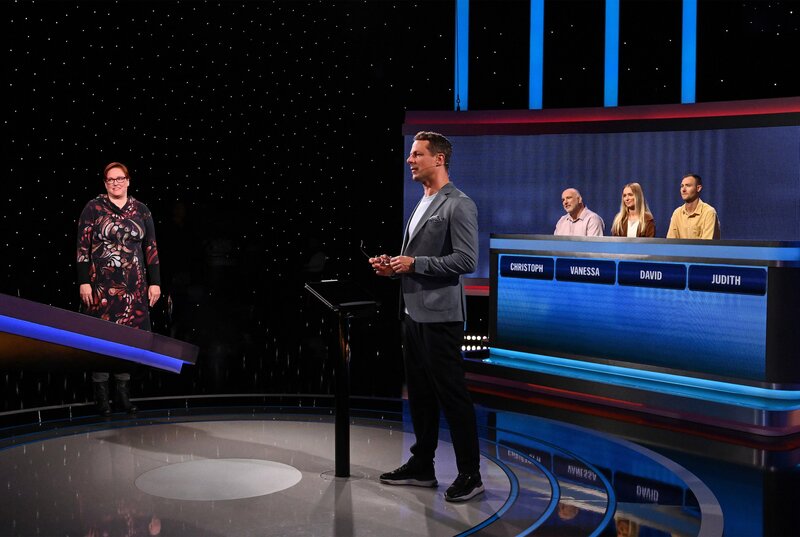 Moderator Alexander Bommes (2.v.l.) mit den Kandidat:innen: Christoph Lembke (3.v.r.), Vanessa Schoen (2.v.r.), David Schröder (r.), Judith Wollstädter (l.).Bild: © ARD/Uwe Ernst