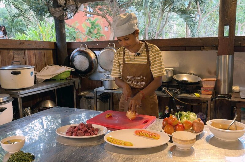 Die Köchin Koeut Sreyneang bereitet Lôc-Lac-Rindfleisch inmitten der Pfefferplantagen zu.