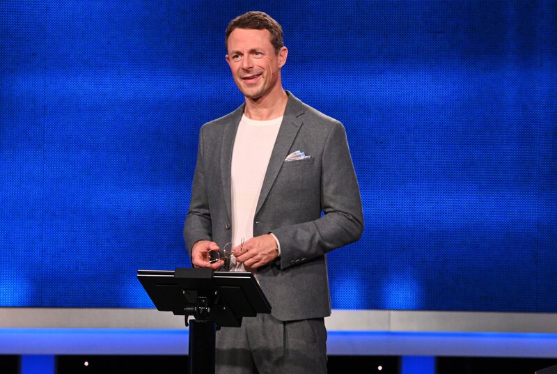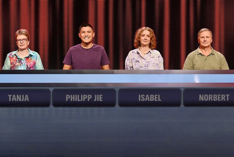 Moderator Alexander Bommes (2.v.l.) mit den Kandidat:innen: Tanja Wippich (3.v.r.), Philipp Jie Müller (2.v.r.), Isabel Fastus (r.), Norbert Höfgen (l.).Bild: © ARD/Uwe Ernst