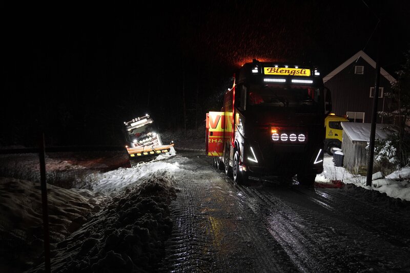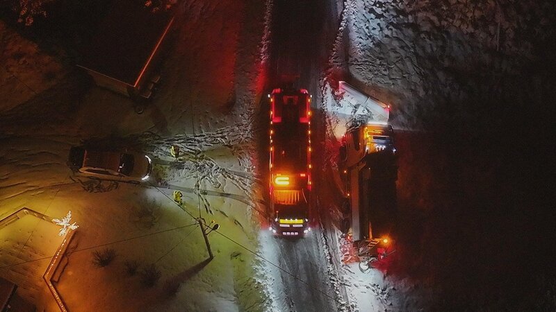 A snow plough slid on ice on a narrow road and ended in the ditch, Jo Roger wants to finish the rescue quickly so the truck can get back on the road to make it safe for other drivers.