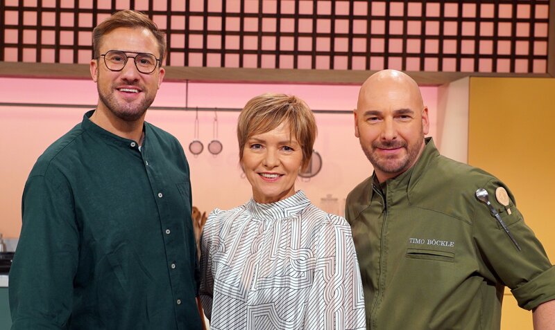 Heute ist der schwäbische Spitzenkoch Timo Böckle zu Gast mit seiner Leidenschaft für Wild. Er bringt einen butterzarten Rehrücken auf den Tisch - begleitet von Maronen und süßer Birne. Sören Anders kontert mit seinem etwas anderen Reh-Geschnetzelten. v.li.: Sören Anders, Evelin König, Böckle