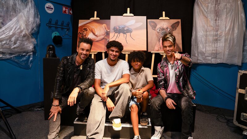 • Die Ehrlich Brothers (Andreas, l. und Chris, r.) helfen Liam (2.v.r.) seinen großen Bruder Danyal (2.v.l.) zu pranken. Bei diesem Prank ist die Sehstärke gefragt. Während Liam selbst klitzekleine Details in den Bildern erkennt, muss Bruder Danyal wieder passen.