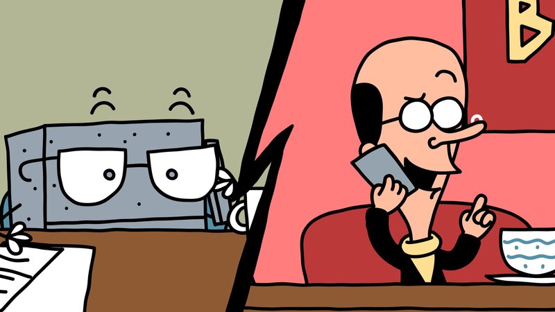 • Herr Zement schimpft mit Trafalgar und Pulver, die auf seinen Zementblöcken stehen und "Statue" spielen.