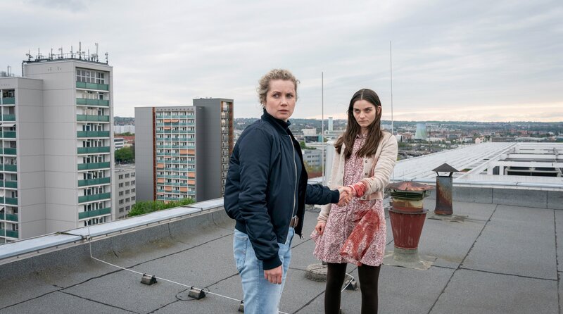 • (v.l.n.r.): Leonie Winkler (Cornelia Gröschel) findet Amanda (Emilie Neumeister) auf einem Hausdach.