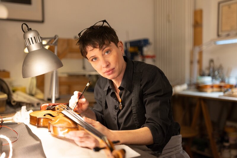 Caroline Tallone lebt in Berlin und arbeitet als Geigenrestauratorin und Musikerin. Sie hat sich ein unabhängiges Arbeitsmodell geschaffen - zwischen Werkbank, Komposition und Bühne. Schon früh in ihrer beruflichen Laufbahn hat sie sich selbstständig gemacht und betreibt ihre eigene Werkstatt. Zudem ist sie als Musikerin und Klangkünstlerin in der freien Musikszene aktiv. Caroline Tallone stammt ursprünglich aus Locarno in der Schweiz, lebte lange in Italien und ist seit 2015 in Berlin. Ihre berufliche Leidenschaft gilt dem Klang: Sie repariert und restauriert Geigen, forscht am Geigenbau und betätigt sich zugleich als Musikerin für zeitgenössische Improvisationsmusik, realisiert Klanginstallationen und komponiert gelegentlich Musik für Kurzfilme. Damit hat sie sich mehrere Standbeine geschaffen, die Kreativität und handwerkliche Präzision verbinden. Seit ihrer frühesten Kindheit leidet sie unter starken Schmerzen und einer damit verbundenen Einschränkungen ihrer Mobilität. Die Diagnose lautet: Infantile Zerebralparese (oder auch: spastische Lähmung). Das wurde jedoch erst im Altern von 35 Jahren festgestellt. Da sie aufgrund ihrer Schmerzen die Anforderungen einer Vollzeitanstellung in Geigenbauateliers nicht erfüllen konnte, beschloss sie schon 2013, noch in Italien, sich selbstständig zu machen und ihre eigene berufliche Zukunft aufzubauen. Ihre Symptome verschlechterten sich im Laufe der Jahre und seit 2021 benötigt sie für längere Strecken einen Rollstuhl, während sie sich zu Hause mithilfe von Orthesen noch recht gut fortbewegen kann. Heute hat Caroline Tallone ein stabiles Arbeitsmodell gefunden. Den Weg in die Selbstständigkeit schaffte sie trotz großer Hürden. Unterstützung bekam sie vom Zentrum Neue Chance für ihre Wohnsituation, beim Arbeitsamt und beim Beratungszentrum enterability, um aufgrund der baulichen Barrieren sowohl in ihrer Wohnung als auch in ihrer alten Werkstatt eine neue Arbeits- und Lebenssituation zu kreieren. Sie musste lernen, sich in der komplexen Bürokratie zurechtzufinden, eine Herausforderung, die alle Selbstständigen ständig begleitet.