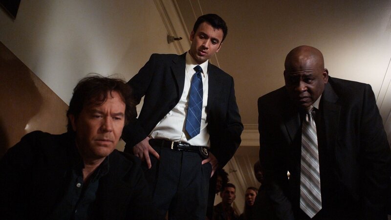 Um herauszufinden, wo ein Hedgefonds-Manager das veruntreute Geld versteckt, mischt das Leverage-Team heimlich K.o.-Tropfen in dessen Trinkflasche und bringt ihn ins Krankenhaus. Nathan (Timothy Hutton, l.) gibt sich als Arzt aus, wovon Charlie (Joshua Sawtell, M) und US Marshal Robert Corville (Victor Morris) nichts ahnen.