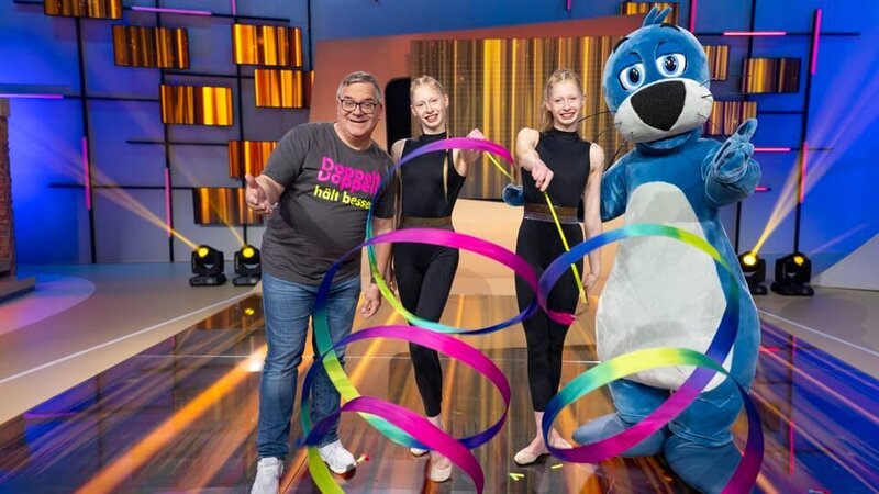 Die Zwillinge Nadiia und Veronika zeigen im Studio ihr Können in rhythmischer Sportgymnastik. Elton (links) und Piet (rechts) freuen sich.