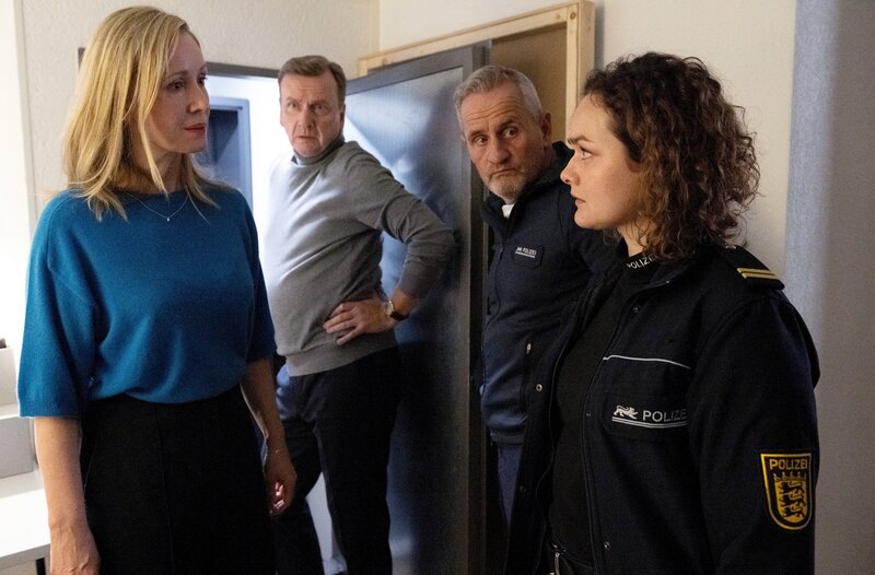 • Silvia Pötsch (Silvina Buchbaue, l.) und Carsten Pötsch (Jörg Bundschuh, 2.v.l.) berichten Paul Schott (Tim Wilde, 2.v.r.) und Julia Demmler (Wendy Güntensperger), dass Emely wieder verschwunden ist.