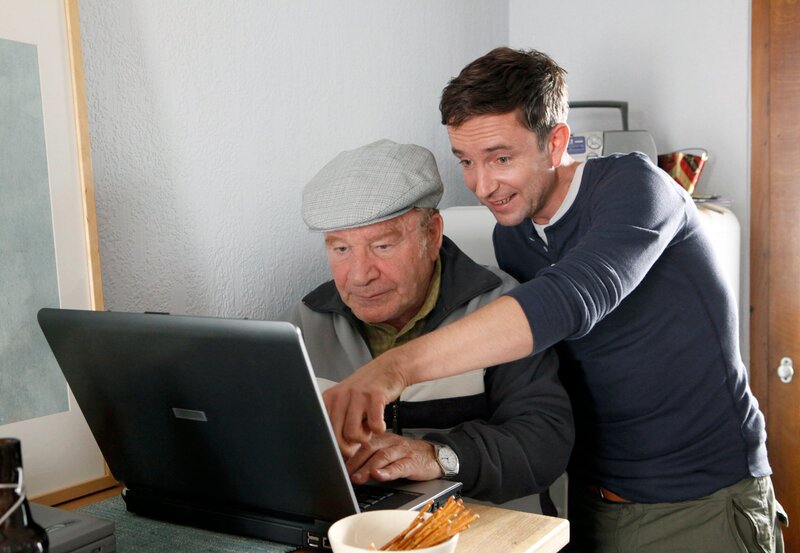 Tierarzt Kauth (Arndt Klawitter, r.) hilft Zielonka sen. (Michael Hanemann) bei seinen Laptop-Problemen.