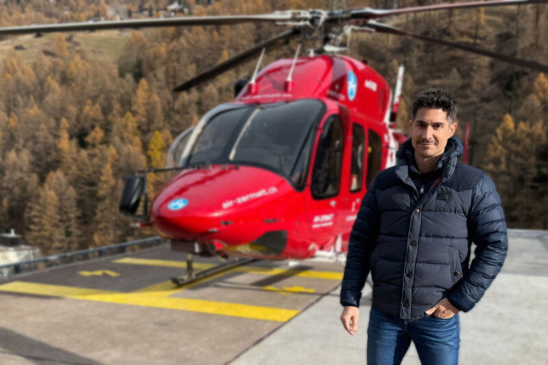• Einstein Was macht die Schweiz zum Helikopterland? Moderator Tobias Müller vor einem Helikopter
