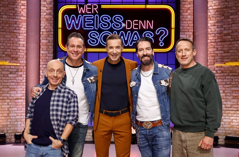 Moderator Kai Pflaume (M.) und seine Rateteam-Kapitäne Bernhard Hoëcker (l.) und Wotan Wilke Möhring (r.) begrüßen in dieser Sendung den Sänger, Komponist, Musikproduzent und Gründungsmitglied der Rockband ‚The BossHoss‘ Sascha Vollmer (2.v.l.) und seinen Band-Kollegen, den Sänger und Grafikdesigner, Alec Völkel (2.v.r.).Bild: © ARD/NDR/UFA SHOW & FACTUAL/Morris Mac Matzen