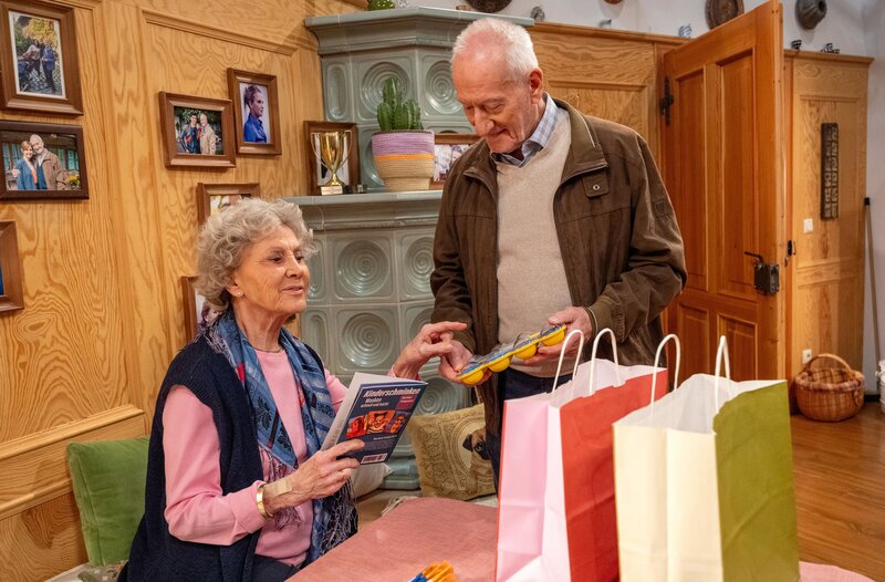 • Hildegard (Antje Hagen, l.) überredet Alfons (Sepp Schauer, r.), sich für ihre Schminkversuche zur Verfügung zu stellen.