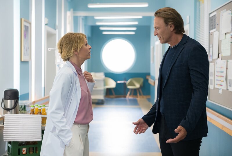 Dr. Ina Schulte (Isabell Gerschke) erkundigt sich bei Dr. Martin Stein (Bernhard Bettermann), was zwischen ihm und ihrer Patientin Petra Minou vorgefallen ist. Denn diese hat Ina gebeten, ihr Martin vom Hals zu halten.