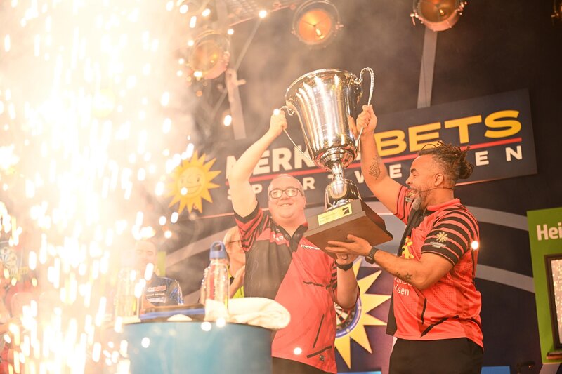 Die Vorjahressieger Stephen Bunting (l.) und Patrick Owomoyela (r.)