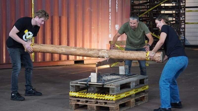 • Bei Checkpoint wird gesägt, aber nicht klassisch, sondern einfach mal andersrum. Mark (links), Tommy und Biany (rechts) versuchen es.