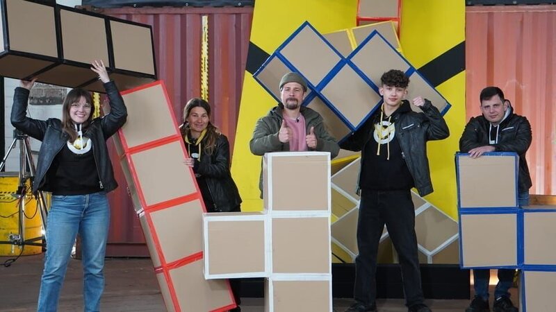 Mädchen vs. Jungs: welches Team schlägt sich besser beim XXL-Tetris? Von links: Lisa, Maja, Tommy Scheel, Faris und Cem finden es heraus.