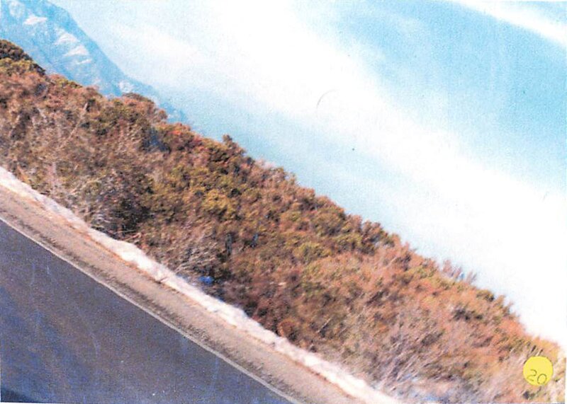 Eine Straße entlang eines Hangs mit Buschvegetation und Schneespuren unter klarem Himmel.