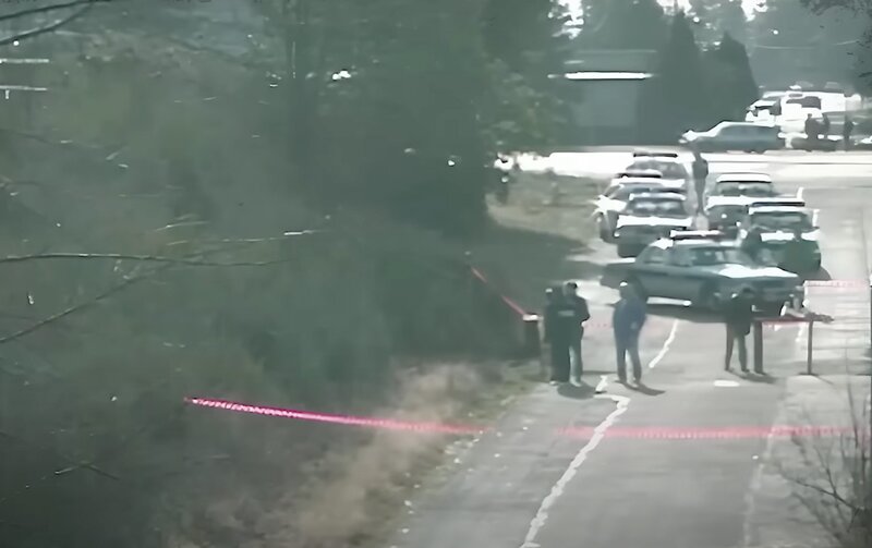 Die Straße ist mit rotem Band abgesperrt, während mehrere Polizeifahrzeuge im Hintergrund stehen.
