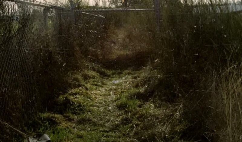 Ein schmaler, überwucherter Pfad zwischen Drahtzäunen führt zu einem sonnigen Ende.