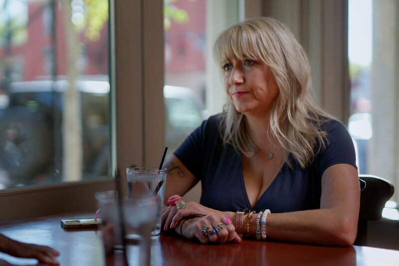 Eine Person sitzt an einem Cafétisch mit einem Glas Wasser und Schmuck an den Händen.