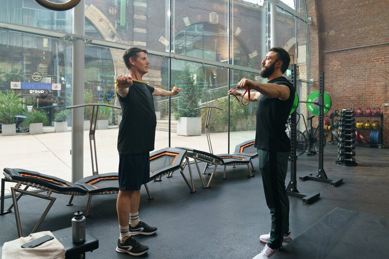 • Masud Ansari (Aslan Aslan, r.) trainiert in seinem Fitnessstudio mit seinem Kunden Thomas Albrechts (Thomas Clemens, l.).