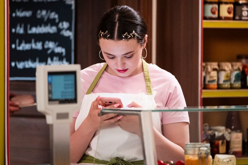 Maja (Godiva Adela) lässt sich bei der Arbeit von ihrem Handy ablenken.