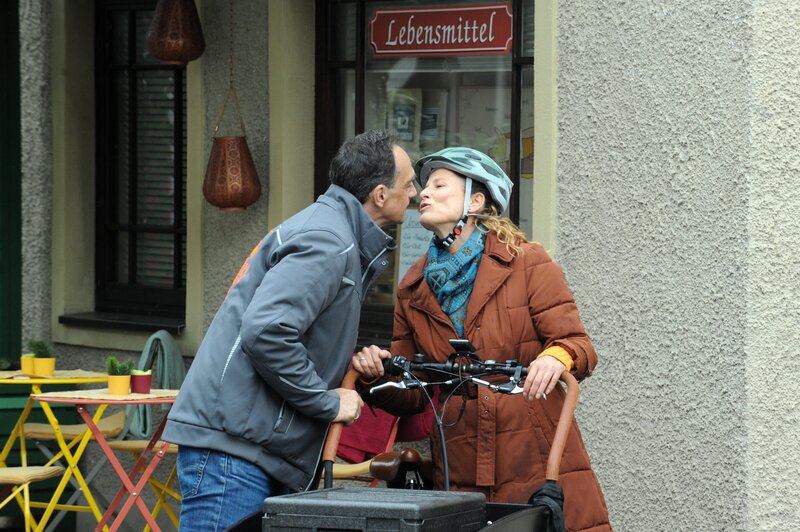 Mike (Harry Blank) verabschiedet Annalena (Heidrun Gärtner), die ihre Catering-Tour mit dem repariertem Lastenrad startet.