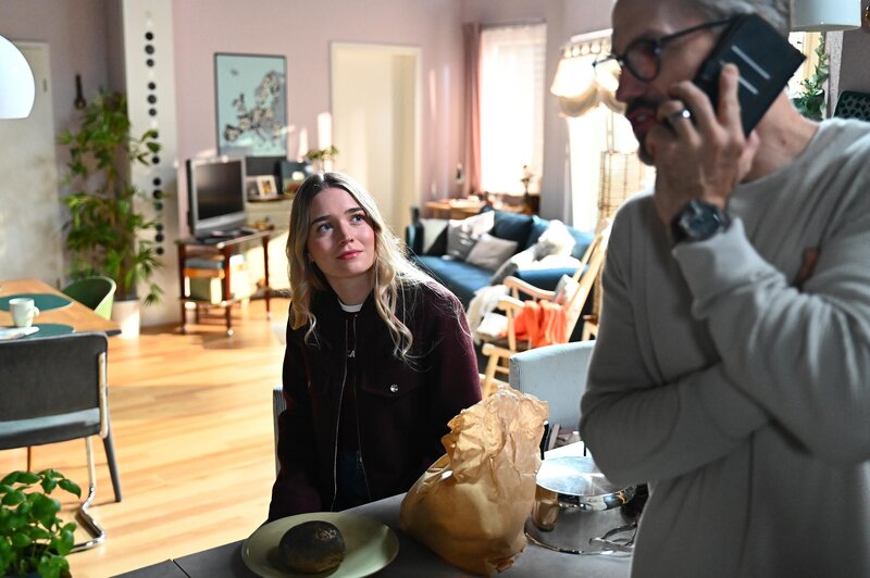 • Henning (Stefan Bockelmann) möchte Lucie mit einem Spontanbesuch überraschen. Links Nele (Maria Müller).