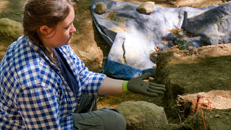 Eine Person sitzt neben einer archäologischen Ausgrabung und zeigt ein kleines Objekt auf ihrem Handschuh.