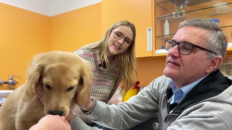• Lena begrüßt Patient Fridolin, einen Golden Retriever Welpen.