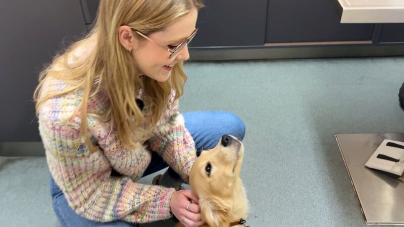 Lena begrüßt Patient Fridolin, einen Golden Retriever Welpen.