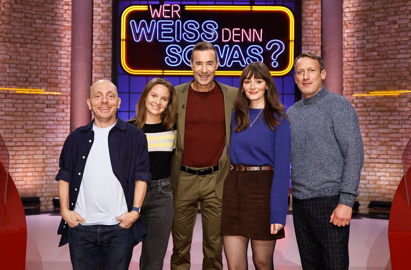 Moderator Kai Pflaume (M.) und seine Rateteam-Kapitäne Bernhard Hoëcker (l.) und Wotan Wilke Möhring (r.) begrüßen in dieser Sendung die Schauspielerin Sonja Gerhardt (2.v.l.) und die Schauspielerin Maria Ehrich (2.v.r.).